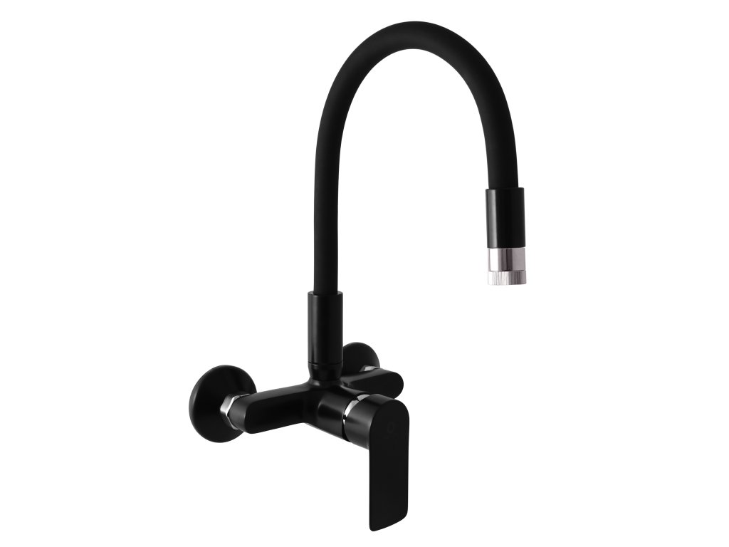Vodovodní baterie dřezová nástěnná s flexibilním otočným ramínkem.