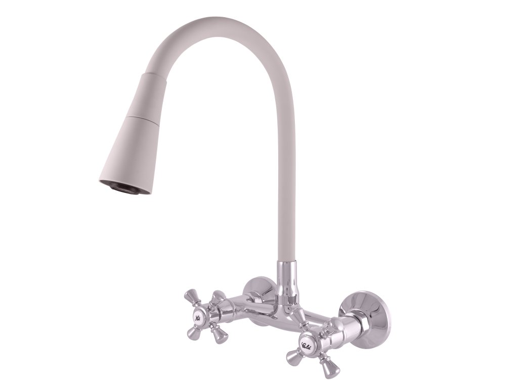 Vodovodní baterie dřezová nástěnná s flexibilním otočným ramínkem se sprchou.