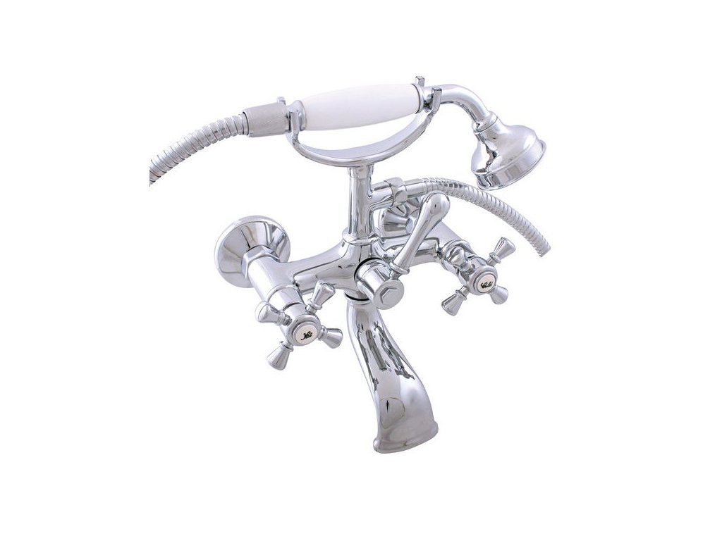 Vodovodní baterie vanová nástěnná s vidlicí na odkládání sprchy a se sprchou.