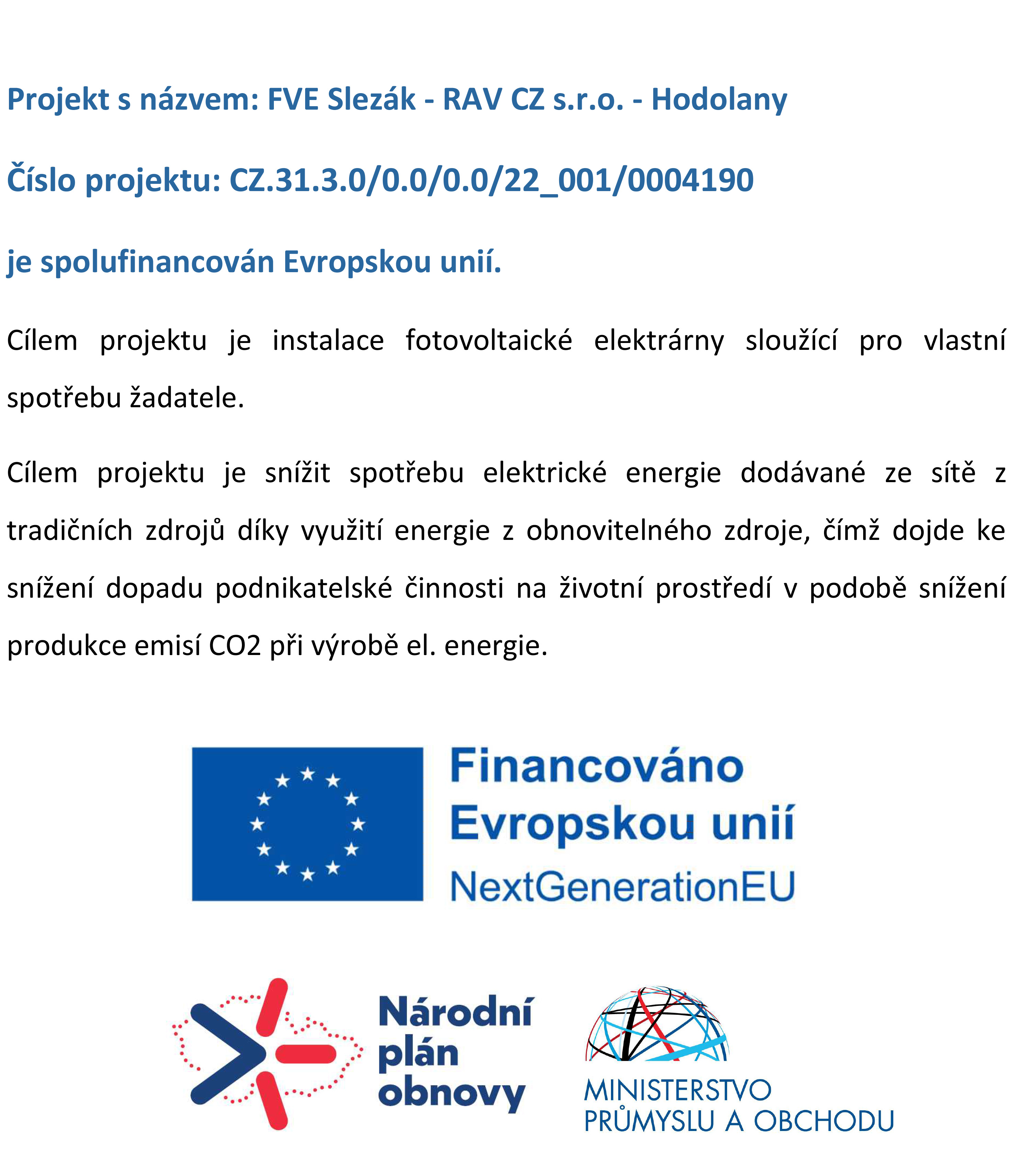 Projekt je zaměřen na instalaci fotovoltaické elektrárny určené k pokrytí vlastní spotřeby žadatele.