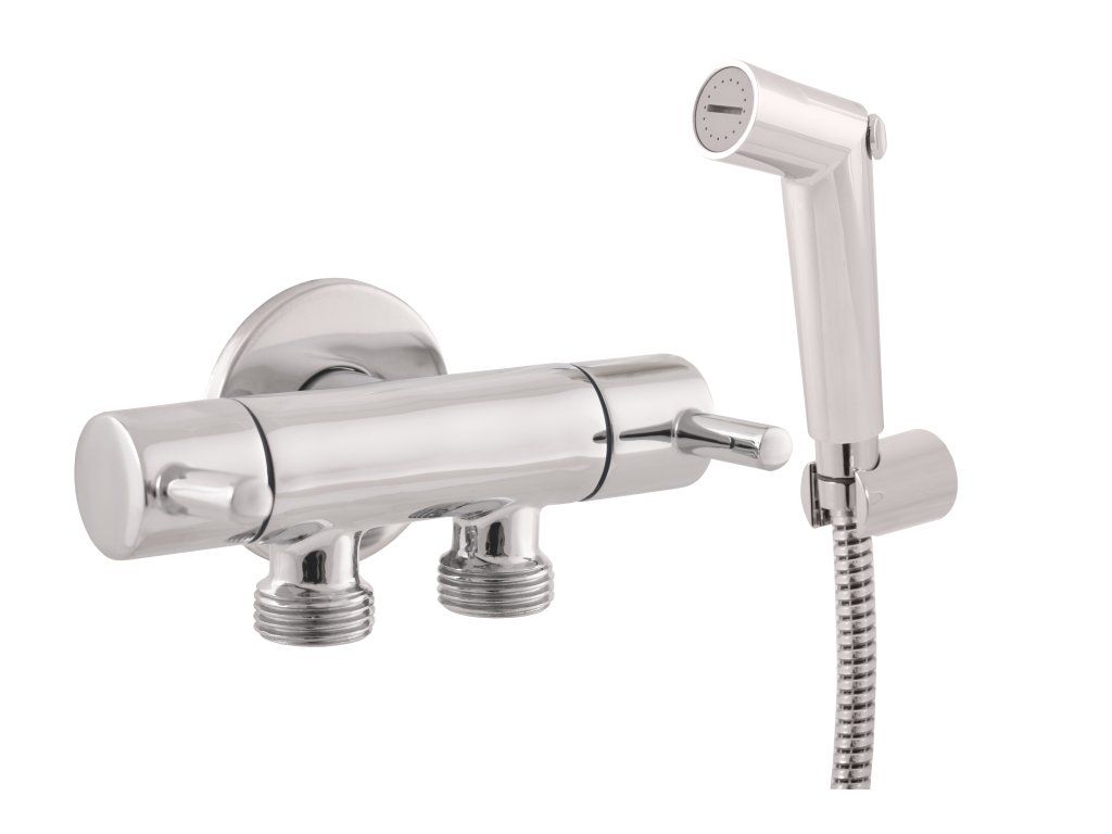 Sprchový komplet s dvojitým rohovým ventilem a bidetovou sprchou.