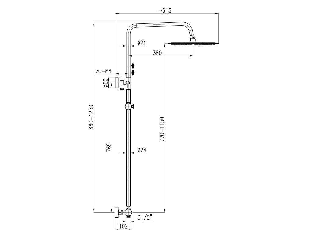 Vodovodní baterie sprchová TERMOSTATICKÁ s hlavovou a ruční sprchou a teleskopickou tyčí se skládá z: