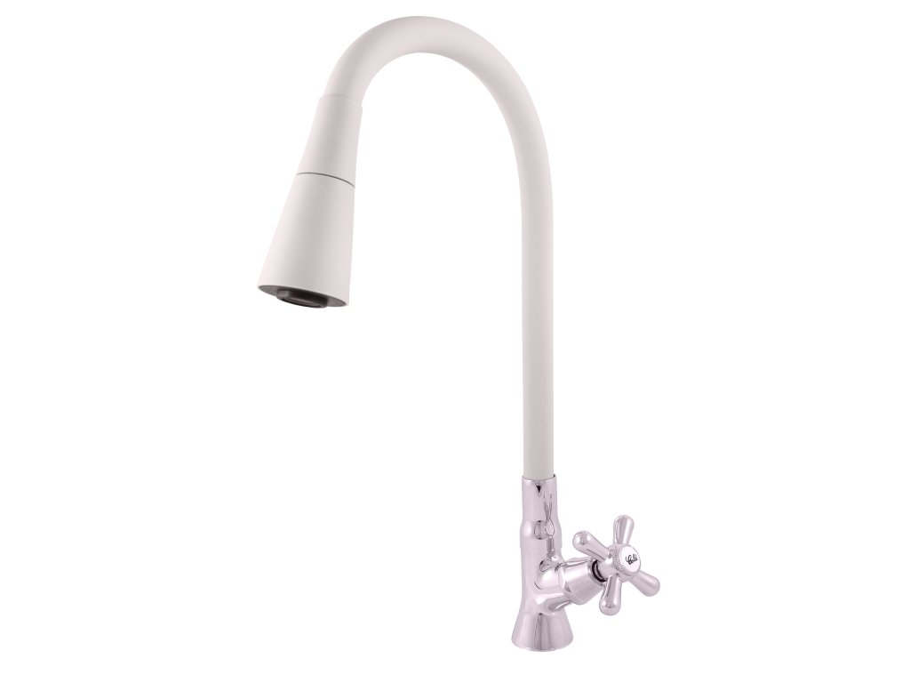 Vodovodní baterie umyvadlová stojánková na jednu vodu s flexibilním otočným ramínkem se sprchou.